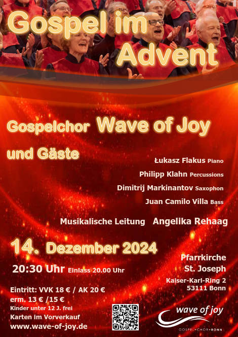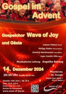 "Gospel im Advent" ist der Titel unseres traditionellen vorweihnachtlichen Konzerts, das seit vielen Jahren (von pandemiebedingten Unterbrechungen abgesehen) im Dezember stattfindet. In den letzten Jahren entwickelte es sich auf Grund der aufwendigeren Gestaltung, insbesondere durch die Unterstützung namhafter Musiker, zu einem echten Highlight unseres Konzertkalenders.