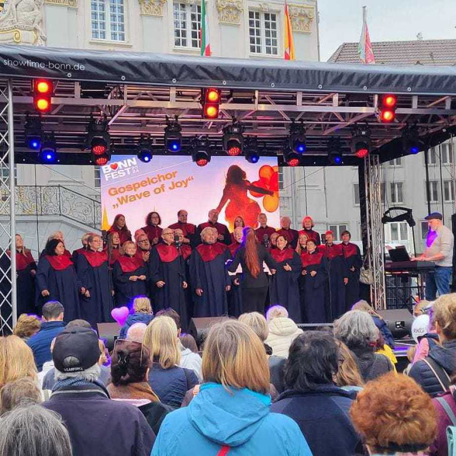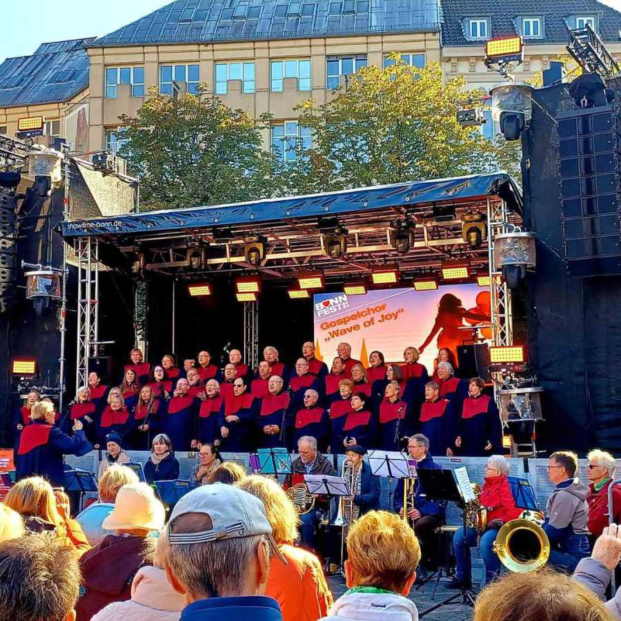 Bonner Publikum. Aber auch der stimmgewaltige Bonner Gospelchor Wave of Joy unter der